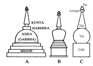 A sztúpa körkörös és négyzetes elemeket egyesítő alaprajzában és vertikális felépítésében nem nehéz fölismerni az ősi indiai mandala sémáját, melyet a főleg Belső-Ázsiában elterjedt gyémántút-buddhizmus is átvett. A mandala (szó szerint „kör”) egy olyan komplex struktúra, mely sűrítve és egymásra vetítve tartalmazza a világegyetem korabeli indiai kozmológiai modelljét és az ember mint mikrokozmosz vázlatát. A mandala ugyanakkor az istenség palotája is, akit a meditáló a világ és önmaga belső lényegeként kontemplál.