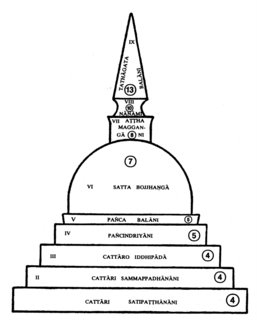 felső részben a harmiká a transzcendens „nyolcrétű ösvényt” jelenti, melyből a megvilágosodott tudat Buddha-természete közvetlenül kiemelkedik. A sztúpa oszlopa e Buddha-tudat tízrétű természetfölötti tudását fejezi ki. Végül a 13 vízszintes korong a megvilágosult Buddhák tizenhárom misztikus képességét jelenti. E 13 képesség, melyek a szellemi úton elérhető legmasabb tökéletesség ismérvei, a következők: A Fölébredett (1) tudja azokat a helyeket, amelyek egy Buddha tanító tevékenységéhez alkalmasak; (2) ismeri a különböző tettek következményeit; (3) ismeri az összes meditációs fokozatot, megszabadulást, eksztázist és magasabb tudatállapotokat; (4) ismeri más lények képességeit; (5) ismeri a lények különféle hajlamait; (6) ismeri a különböző létsíkokat; (7) ismeri azokat az utakat, amelyek bármely kívánt cél megvalósításához vezetnek; (8) emlékszik a korábbi újjászületéseire; (9) tudja saját és mások halálának és újjászületésének az időpontját (10) meg tudja semmisíteni a rossz erőket; (11-13) rendelkezik a Buddhák különleges éberségének három alapzatával.