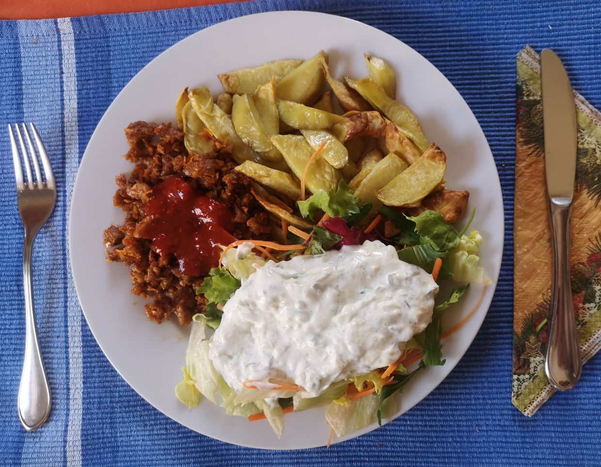 Kezdjük a tzatzikivel és a csípős szósszal, mert ezeknek jót tesz, ha állnak egy kicsit a hűtőben. Ezután készítsük elő a salátát, süssük ki a krumplit, és a legvégére hagyjuk a szejtánt, mert hamar elhűl, márpedig a legjobb frissen fogyasztani.