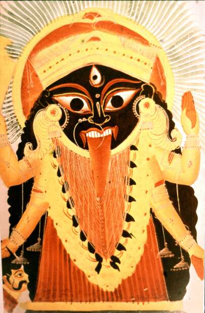 Kálí az istennőnek azt az arcát állítja elénk, amellyel ismét visszavesz mindent, amit teremtett. Neve arra is utal, hogy elnyeli az időt ( = kála), s benne a természet újra felveszi saját őseredeti színtelenségét vagy formátlanságát, mely ugyanakkor potenciálisan minden színt és formát tartalmaz. Ezt jelképezi az istennő nevében és ábrázolásában is hangsúlyozott fekete szín. A mulandósággal való kapcsolatát jelzi lakóhelye – a holttestek égetésére szolgáló temetőhely, ahol emberi csontok és oszló húsmaradványok között végzik szertartását. Csak az olyan jógiból nem vált ki többé szorongást, akinek már nincs földi vágya. A hullaégető helyen ezeket a vágyakat égeti ki magából a meditáló. Az istennő feketesége azt is jelzi, hogy túl van a fogalmakkal leírható tartományon. Minden dolgot és formát az ürességbe von vissza. Mentes mindentől, amit ismerünk. Meztelensége arra utal, hogy nem ölti magára az érzéki formák ruházatát, hanem természete olyan, mint a tér. Ő az egész mindenséget magában hordó határtalan női őserő, akinek üvöltése átjárja és élteti az univerzumot.