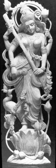 A Védák egyik fontos alakja a vízistennő Szaraszvati, a Himálajában eredő azonos nevű folyó leánya. Eredetileg a tisztaság és termékenység, s az ezek biztosítására a folyóparton bemutatott rítusok felügyelője. Ez vezetett ahhoz az elképzeléshez, hogy elősegíti a vallásos himnuszok keletkezését – így később Vákkal, a beszéd istennőjével azonosították. A legenda szerint ő találta fel a szanszkrit nyelvet. Ő fedezte fel a Himálajában az amritát, a halhatatlanság vizét is, és vitte azt el a többi isteneknek. Egy időben a mindenség óceánból született anyjaként tisztelték, aki áthatja az eget és a földet. Brahmá, a teremtő társnője és teremtménye, s ő a szentírás, a Védák anyja, amennyiben azok az ő tudatában keletkeztek. Az Isten szavaként ő vitelezi ki Brahmá teremtő ötleteit. A későbbi mítoszokban azonban csökkent a hatalma, s a középkortól a művészetek, költészet és zene, tudomány istennője. Hattyún vagy páván lovagol.